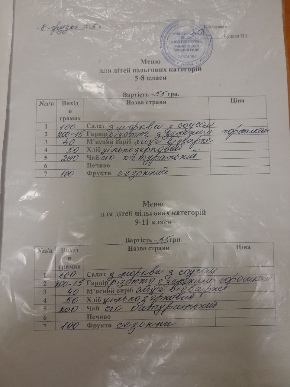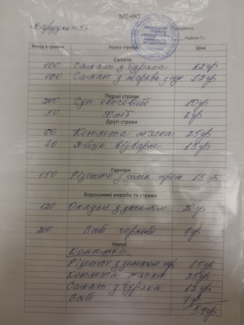 Меню старша школа